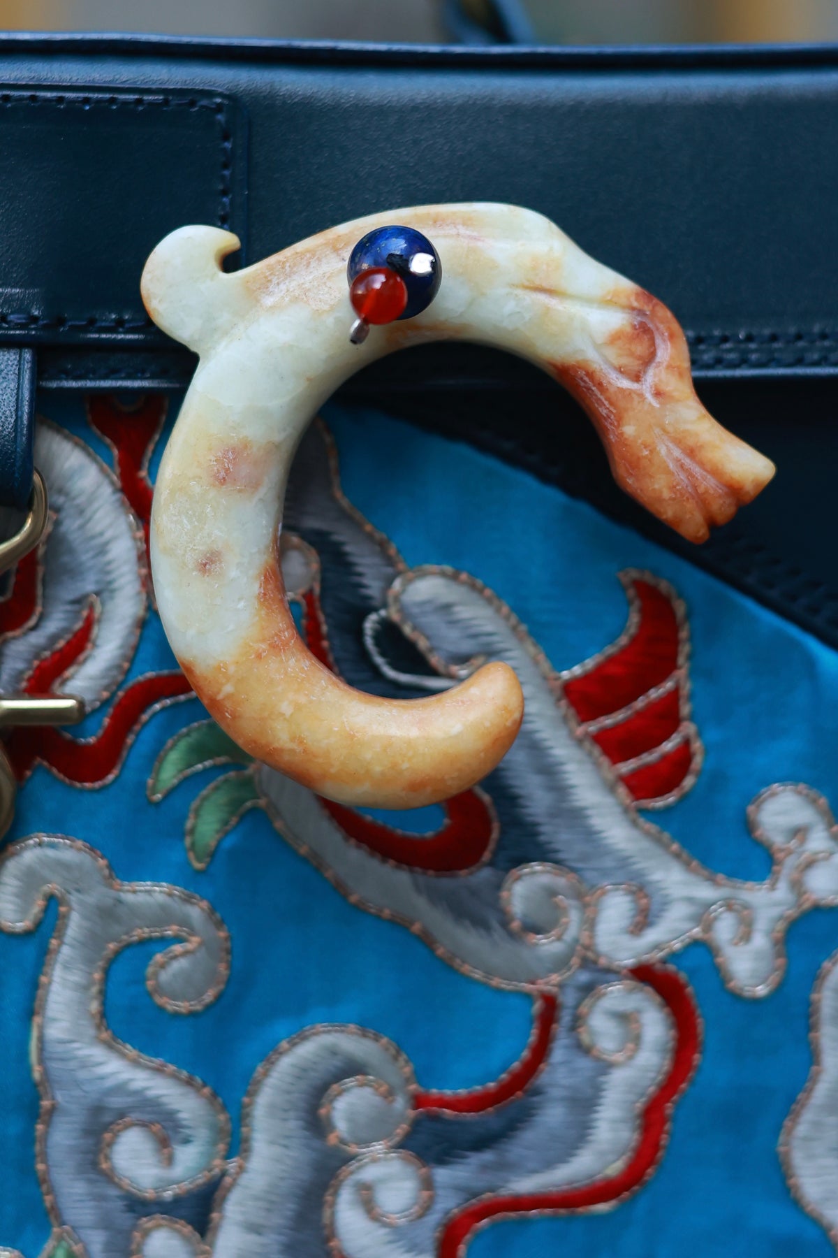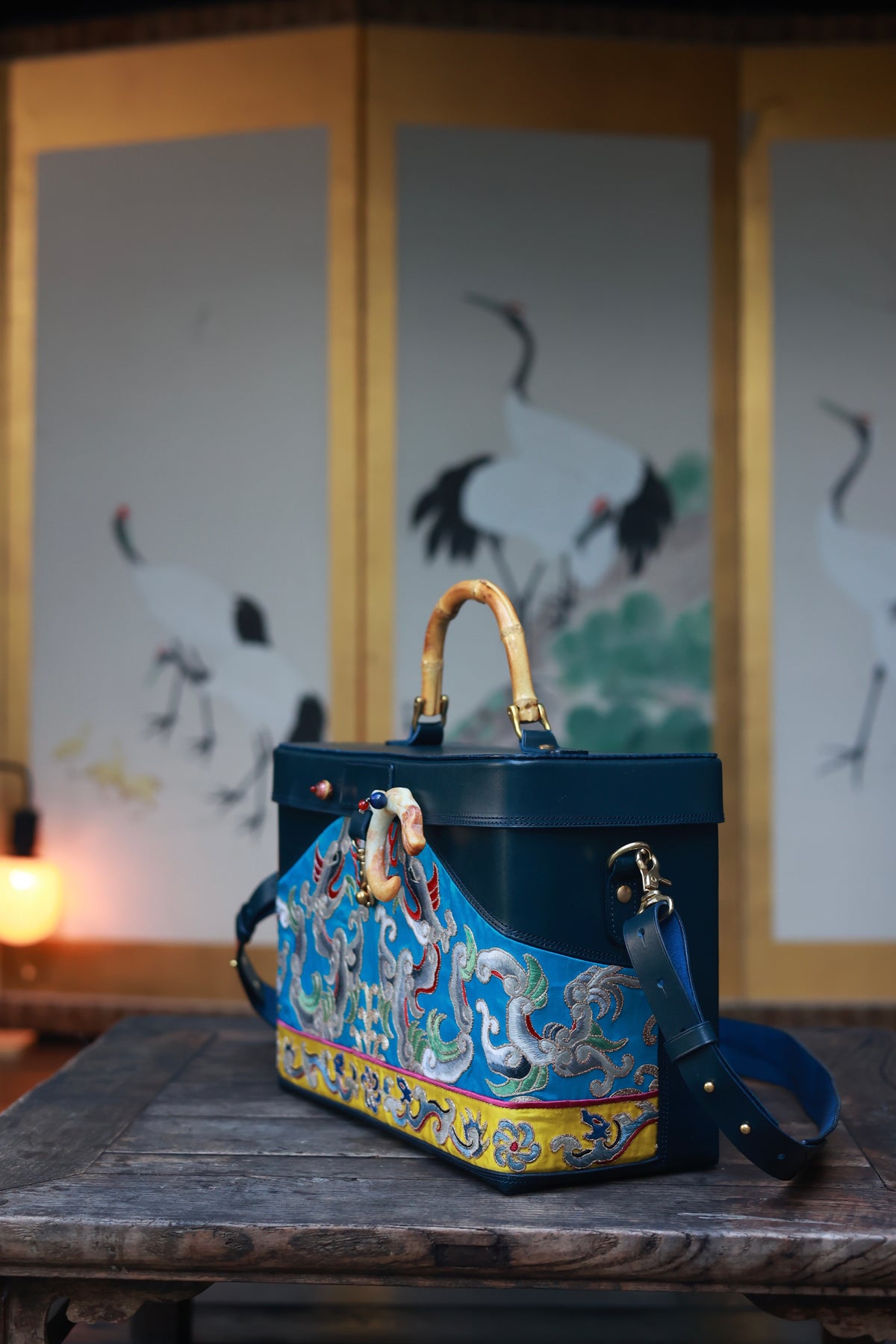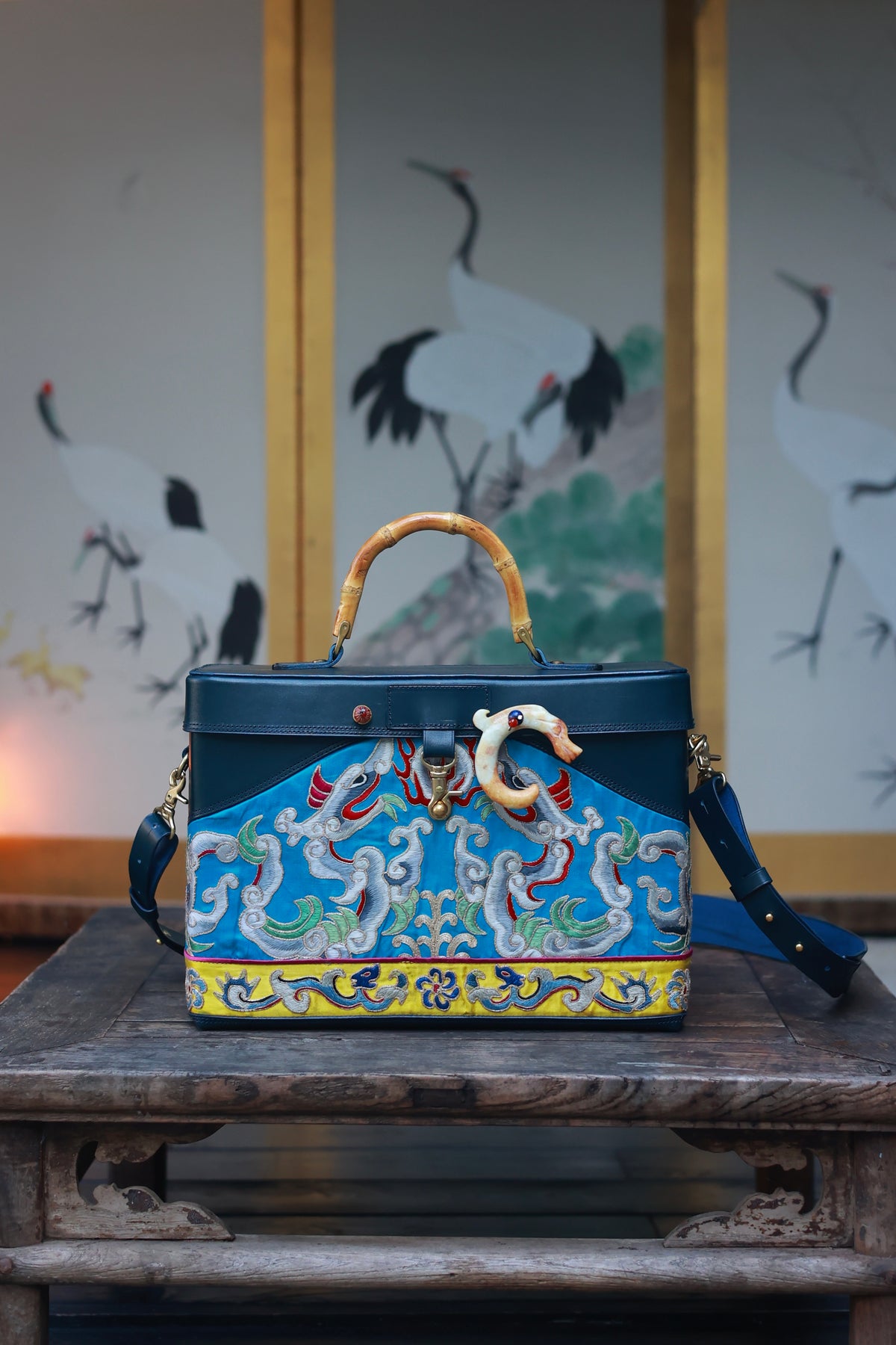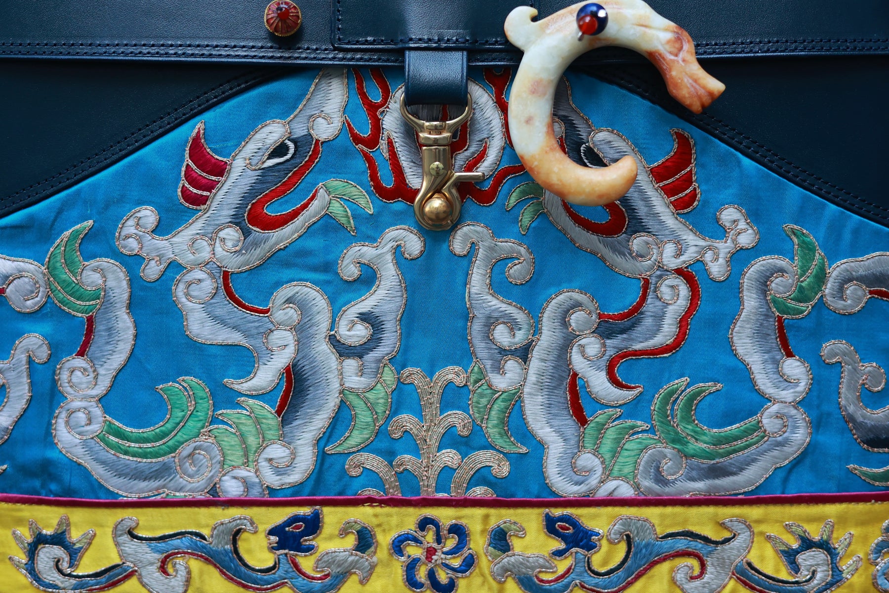 A regal masterpiece featuring an authentic Late Qing double-dragon embroidery. These symmetrical dragons were symbols of imperial power, making this original textile a high-value collectible. A rare opportunity to own a fragment of history reimagined into a one-of-a-kind statement piece.