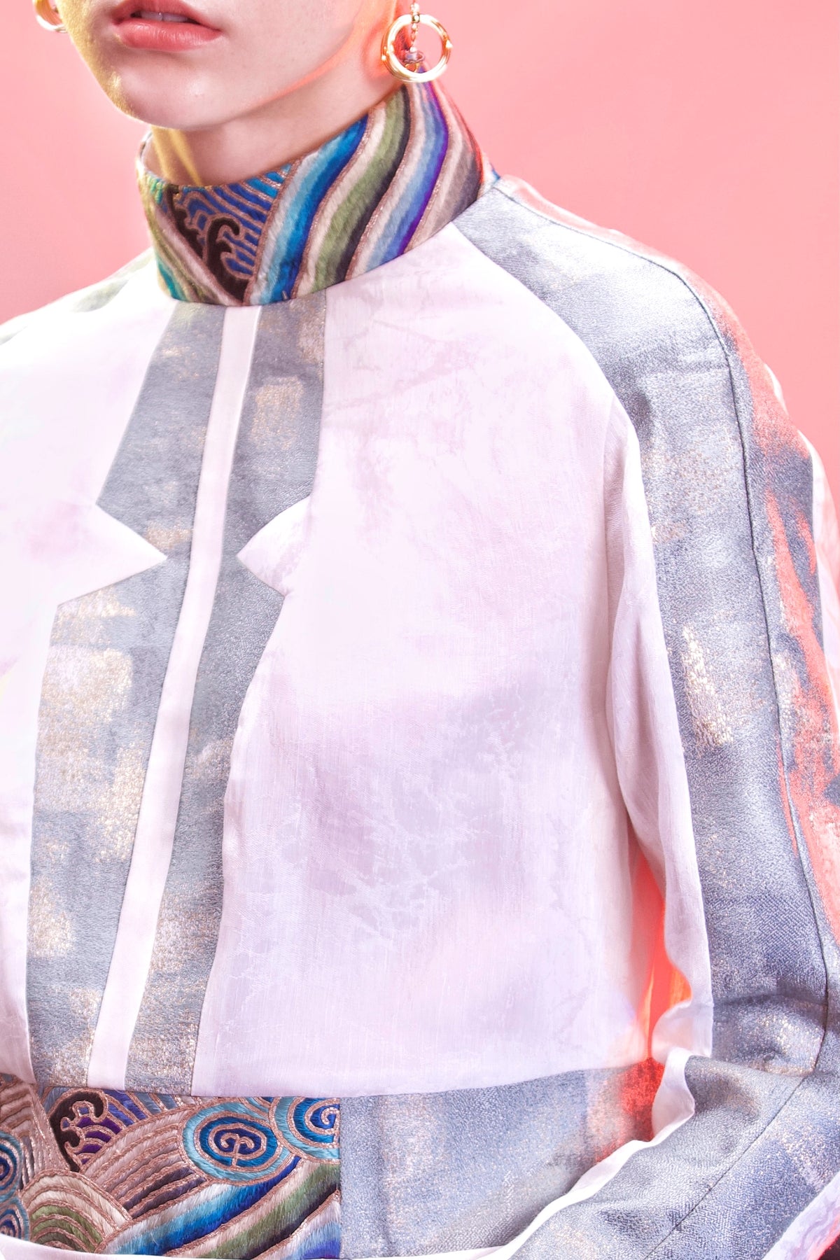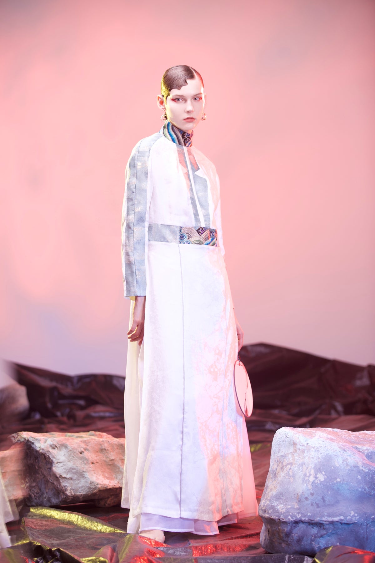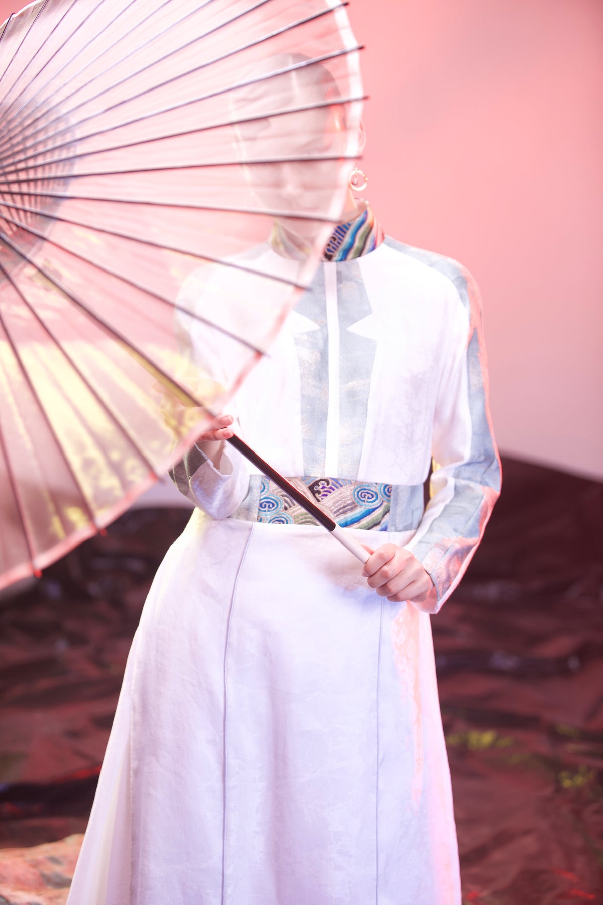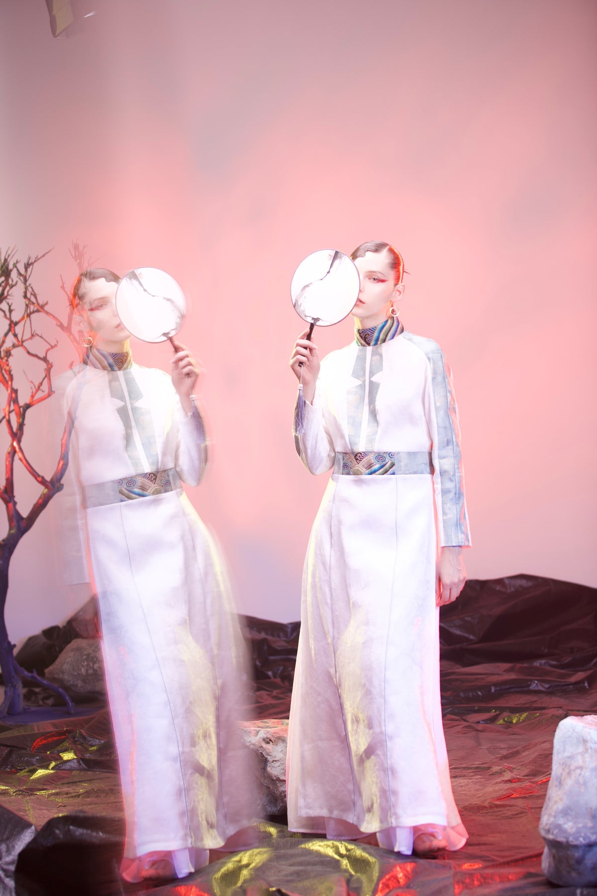 A romantic reimagined Qipao blending antique embroidery with silk-linen. The unique four-panel skirt offers a poetic, flowing movement, while long sheer sleeves add an ethereal, dreamy touch. A perfect masterpiece of heritage and modern elegance, creating a captivating, airy silhouette for the contemporary soul.