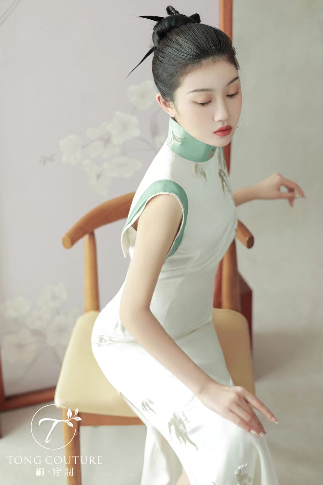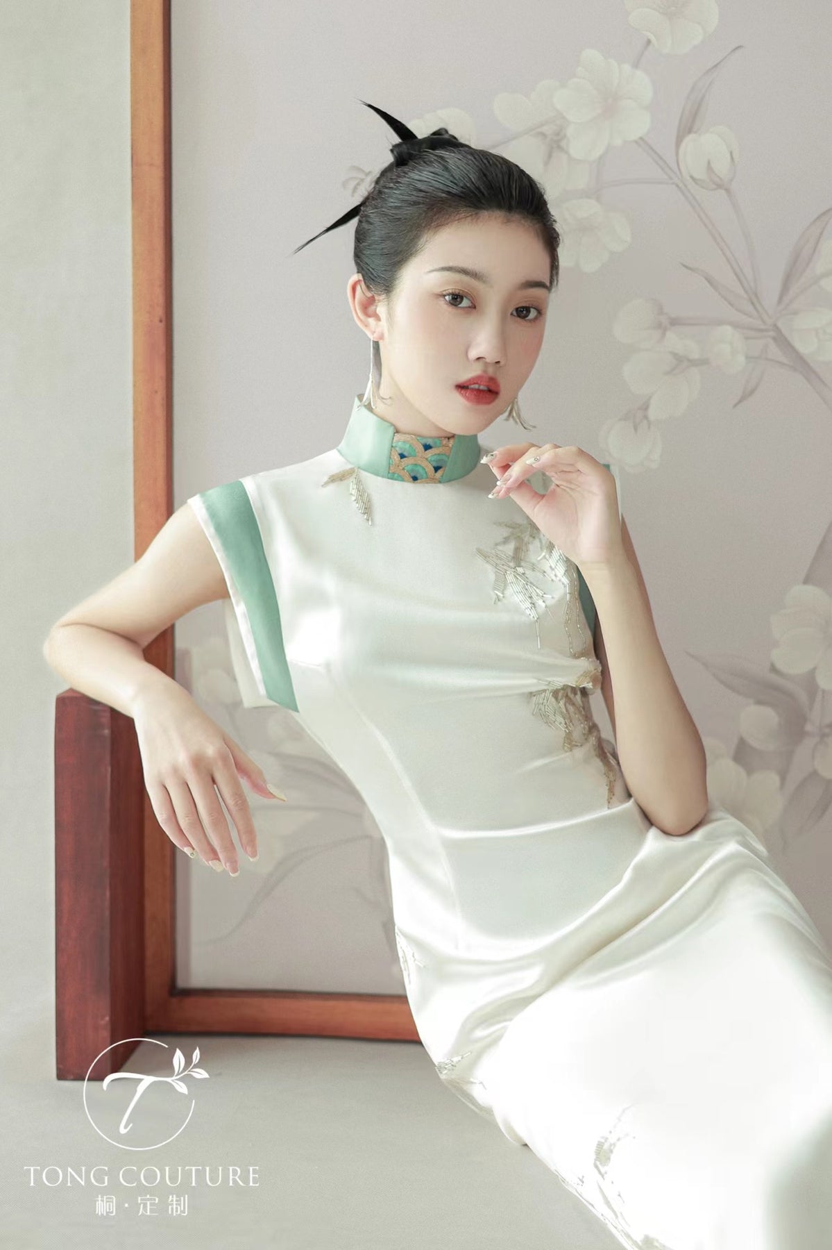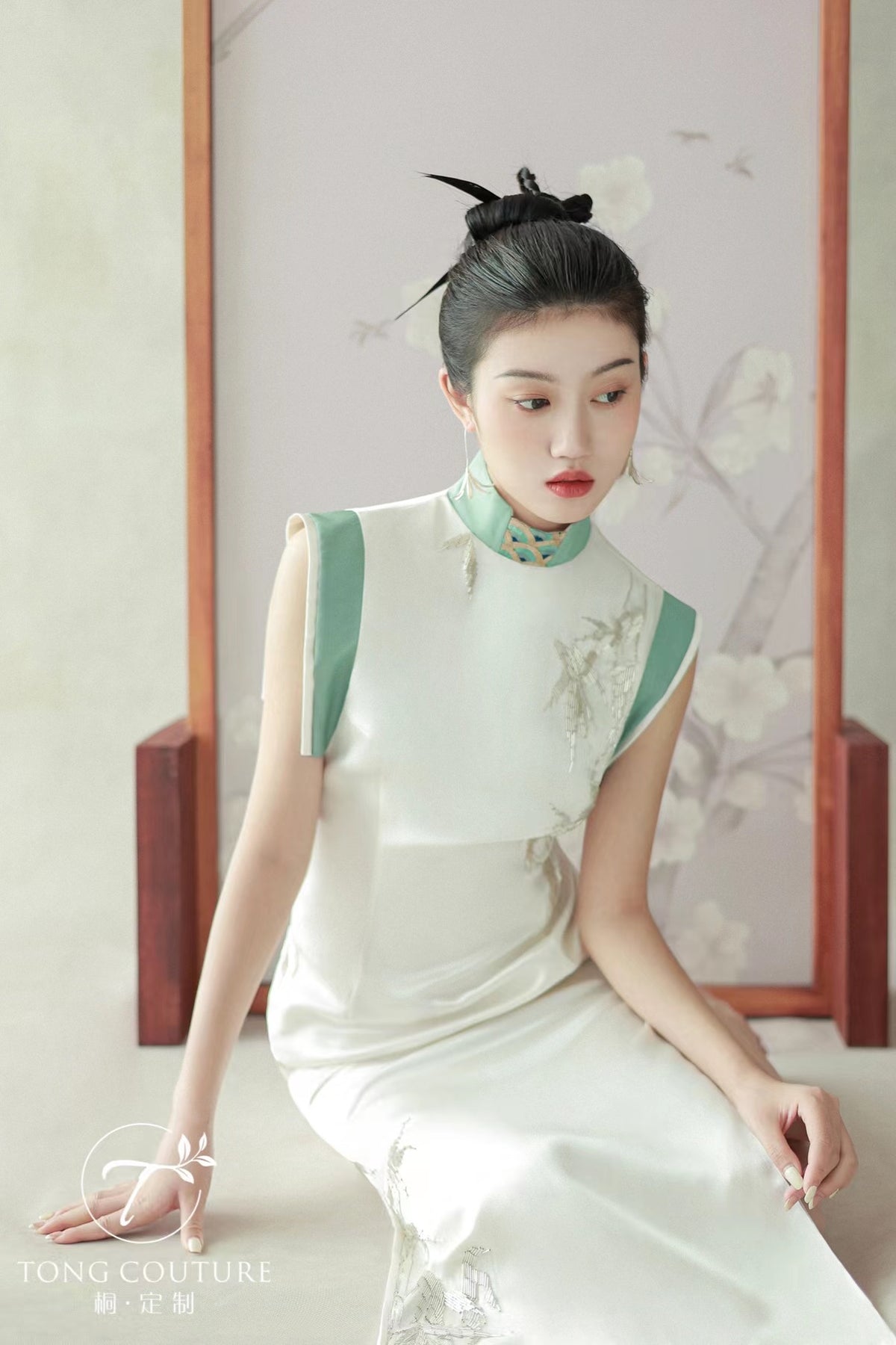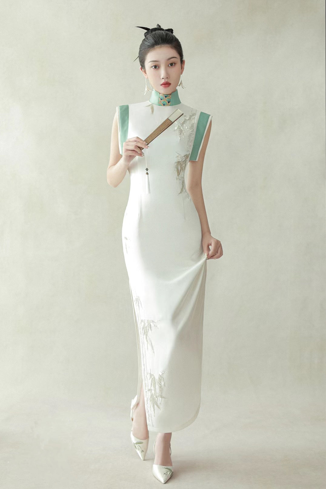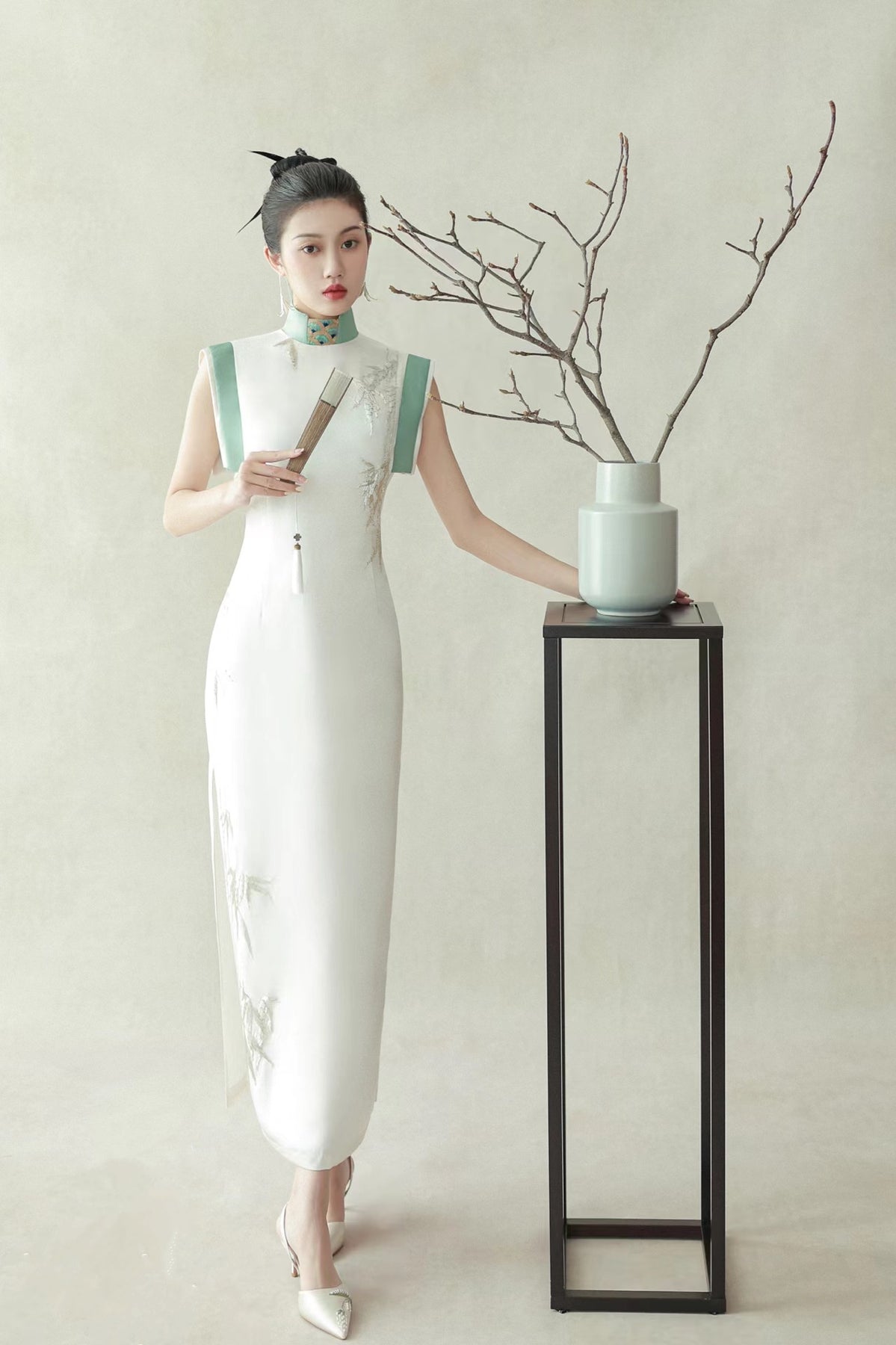 A sophisticated dialogue between East and West. This reimagined Qipao fuses the traditional silhouette with intricate French Luneville embroidery, featuring a delicate bamboo motif.