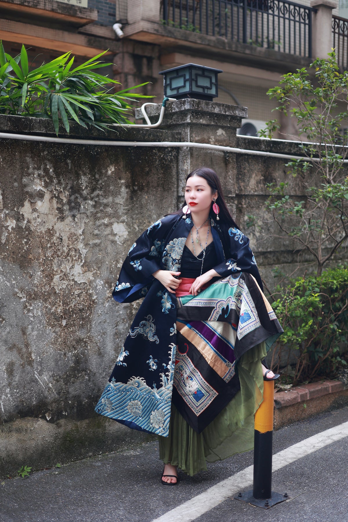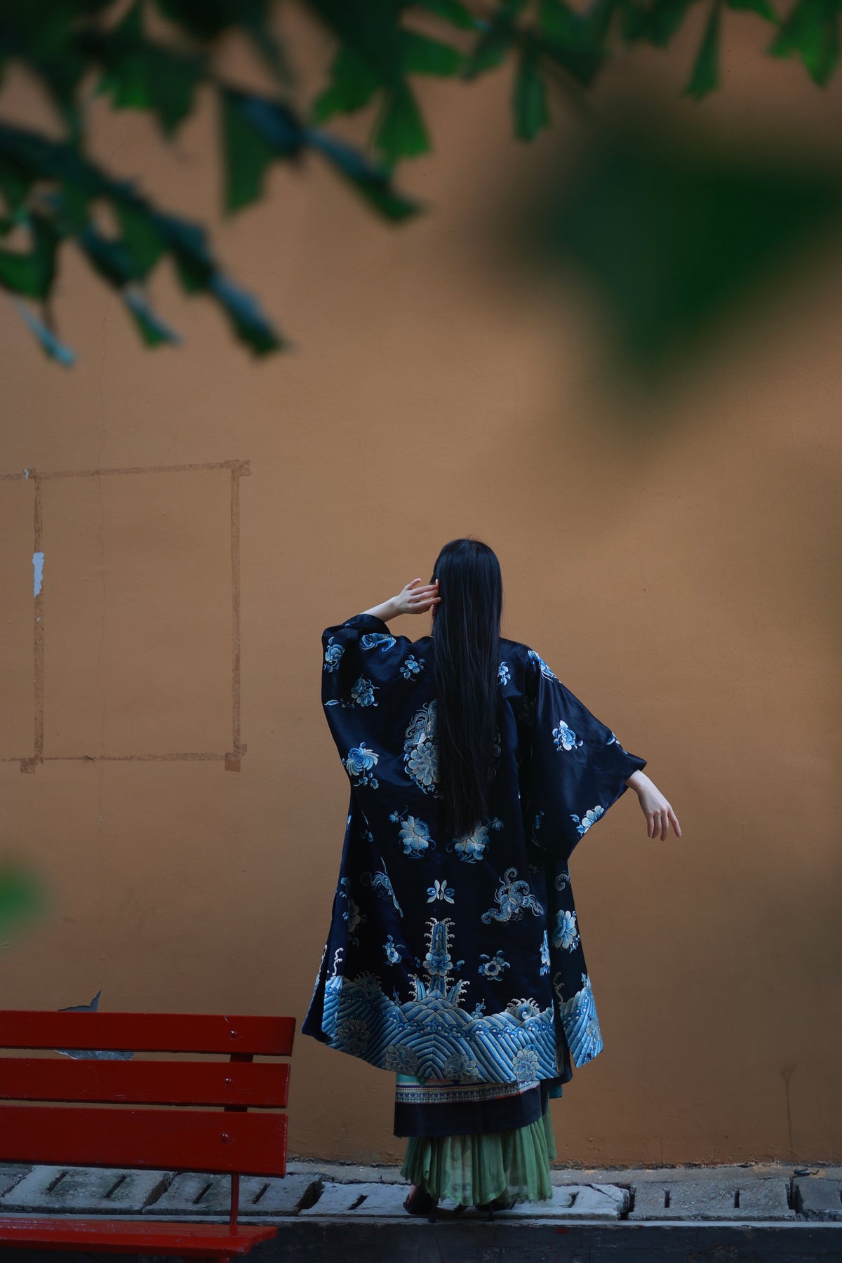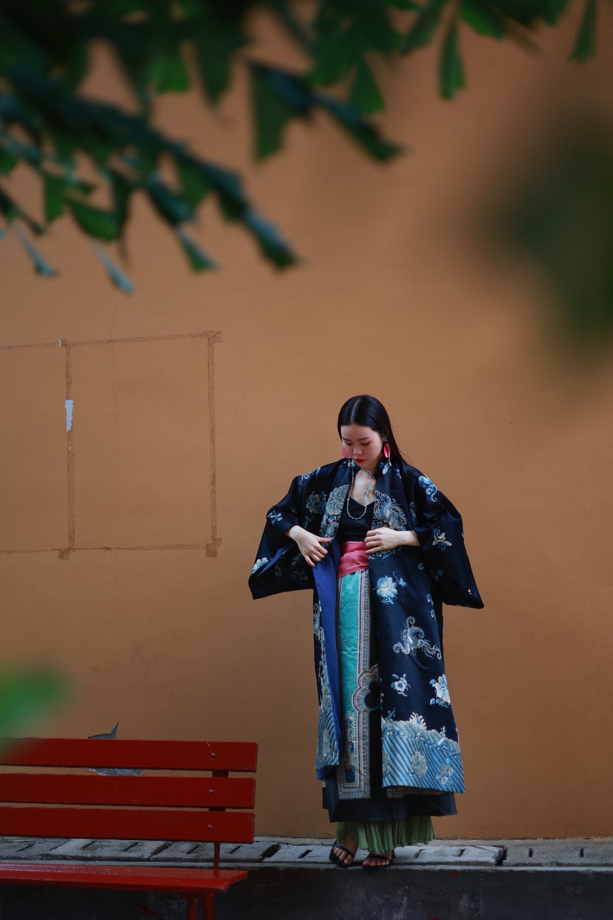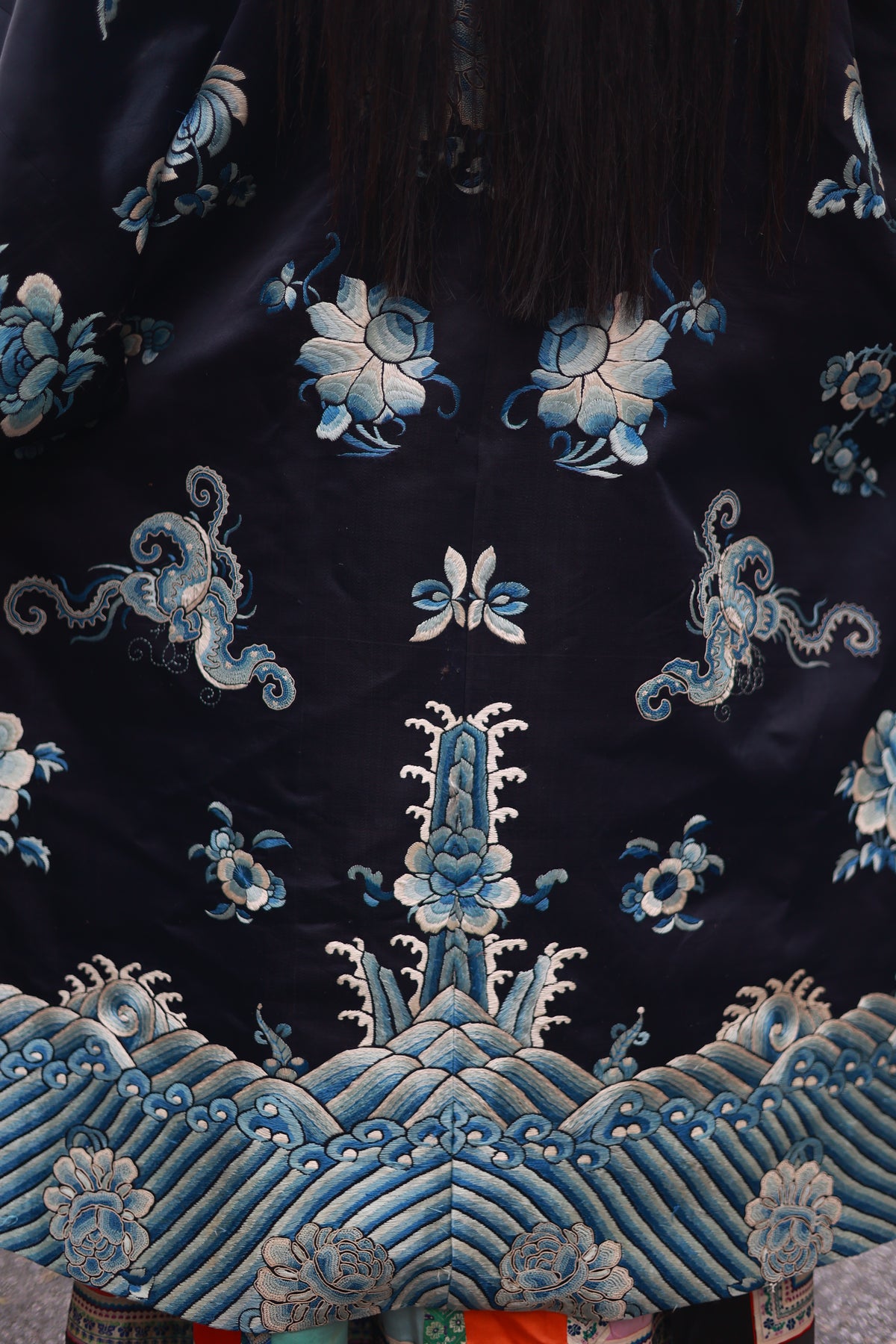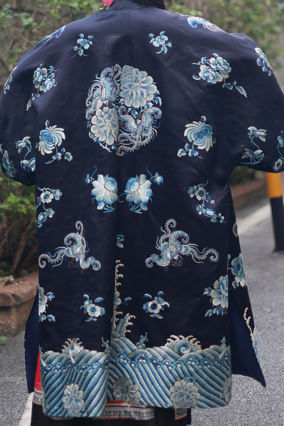 A pinnacle of Qing Dynasty artistry, this original robe features 'Sanlan' embroidery—a prestigious technique using three distinct shades of blue. Renowned for its elegant depth and rarity, this piece offers immense collectible value, embodying the refined aesthetic of imperial-era scholars and nobility.